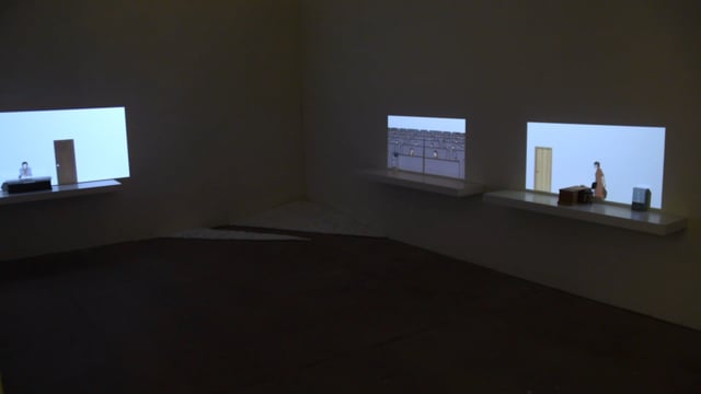 Dual-channel projected animation, balsa wood, fabric, plywood, paper, glass jar, resistors, beads